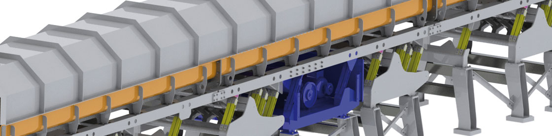 Casting coolers are designed to cool cast parts after being freed from sand from approx. 500 – 650 °C down to 100°C. This allows castings to be treated direct in the downstream shot- blasting plant. Material handling here is based on resonance trough conveyors. As a rule, these are built with vibration absorbers and screwed-on hoods that follow the vibration movement. In a counter-current process air generated by a ventilator is blown in. The channel-type design of the resonance trough assists the air flow. A powerful cold air stream is introduced into the flow channel in the opposite direction of the casting conveyance direction to cool down the cast parts. This cooling process can be assisted – depending on the application – by a temperature-controlled water spraying system.