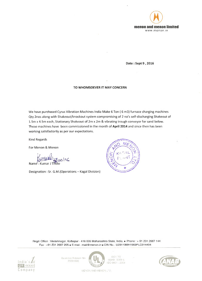 Menon and Menon Ltd., an Indian producer of automotive components, confirms the successful cooperation and quality of products and employees. In April 2014 two charging machines as well as two shake-out grids with a size of 1.5 m x 4.5 m each were commissioned for charging the 6-ton induction furnace. Another stationary shake-out grid sized 2.0 m x 2.0 m with a trough conveyor for transporting moulding sands also formed part of the order.